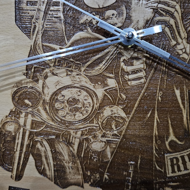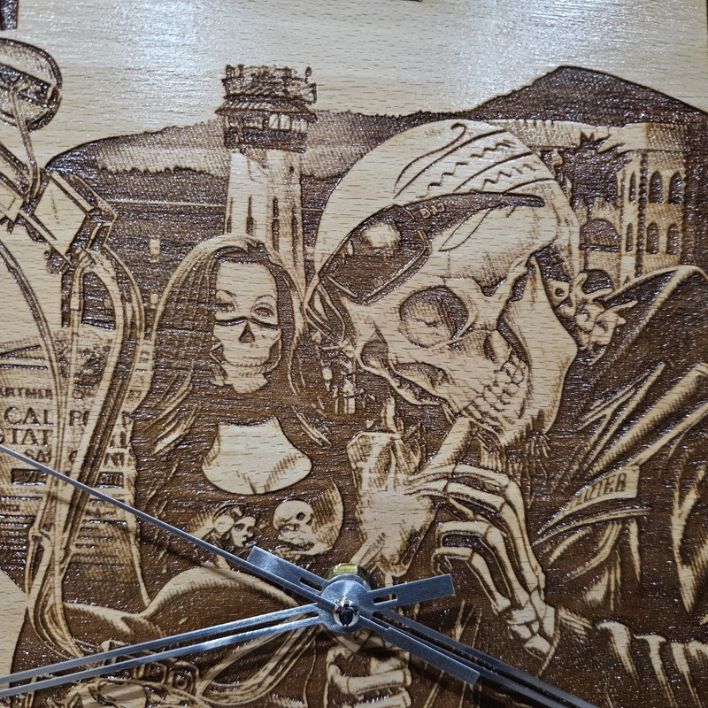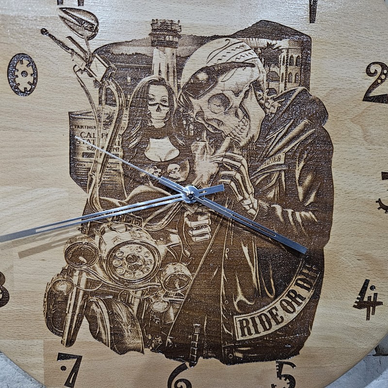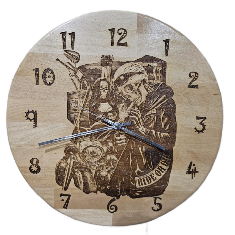Nástěnné hodiny z masivního buku, kulatý tvar s motivem lebka.