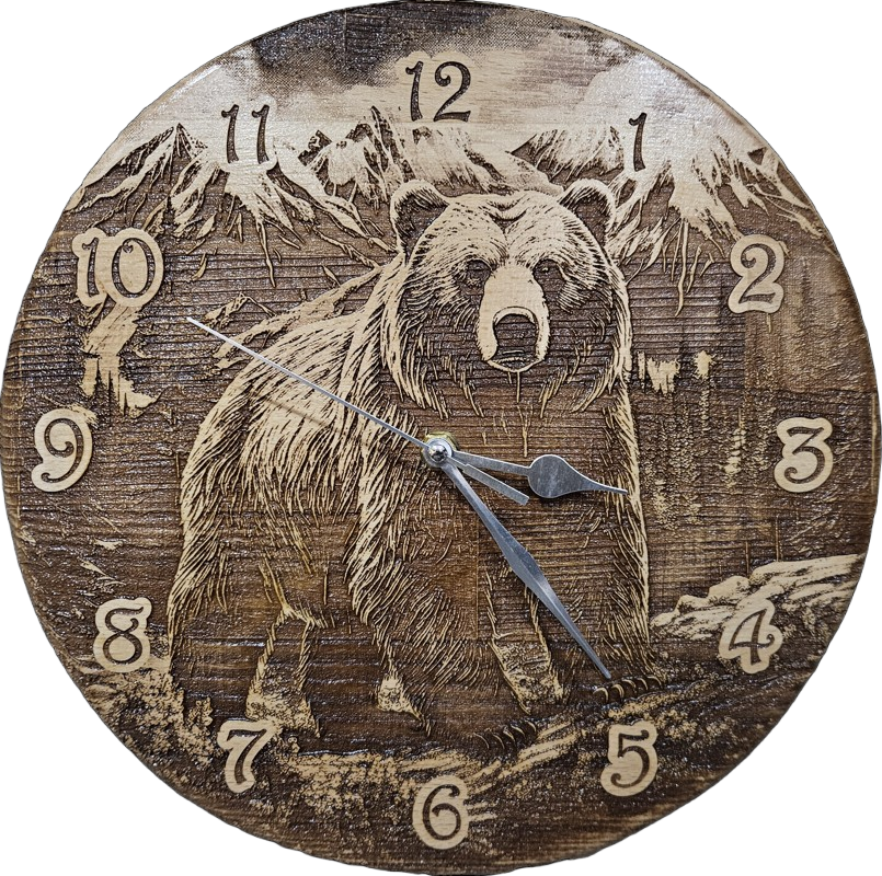 Nástěnné hodiny z masivního buku, kulatý tvar s motivem medvěd