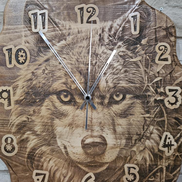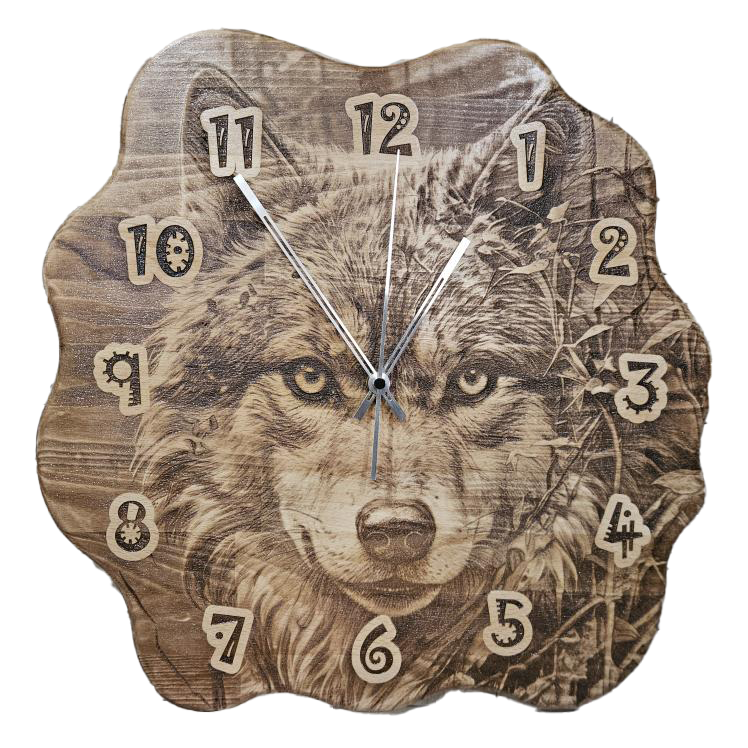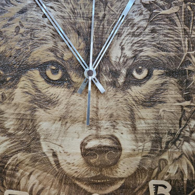 Nástěnné hodiny z masivního buku, kulatý tvar s motivem vlk.